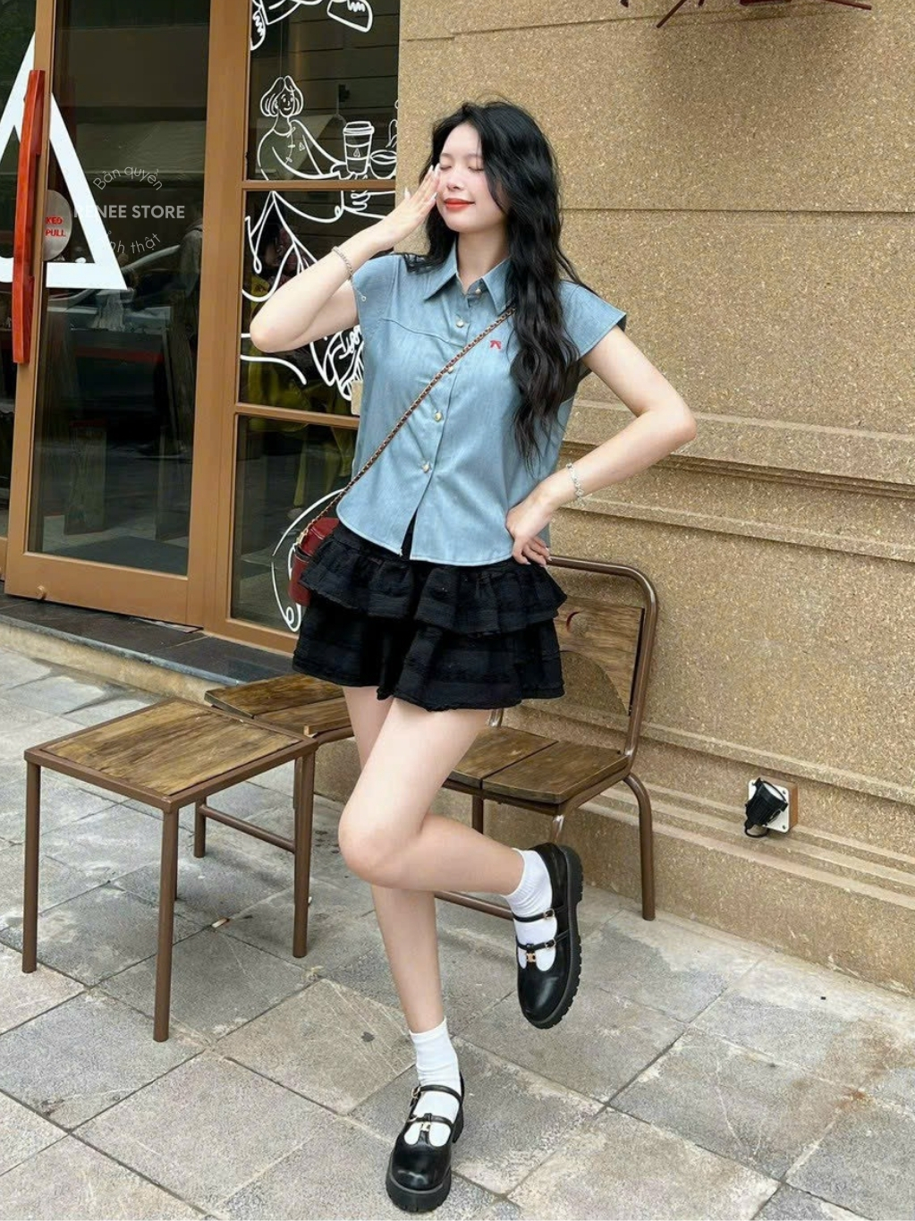 Áo sơ mi Mùa Hè denim tay hến thêu nơ phối cúc đồng phong cách trẻ trung năng động Renee Store - AS2133.