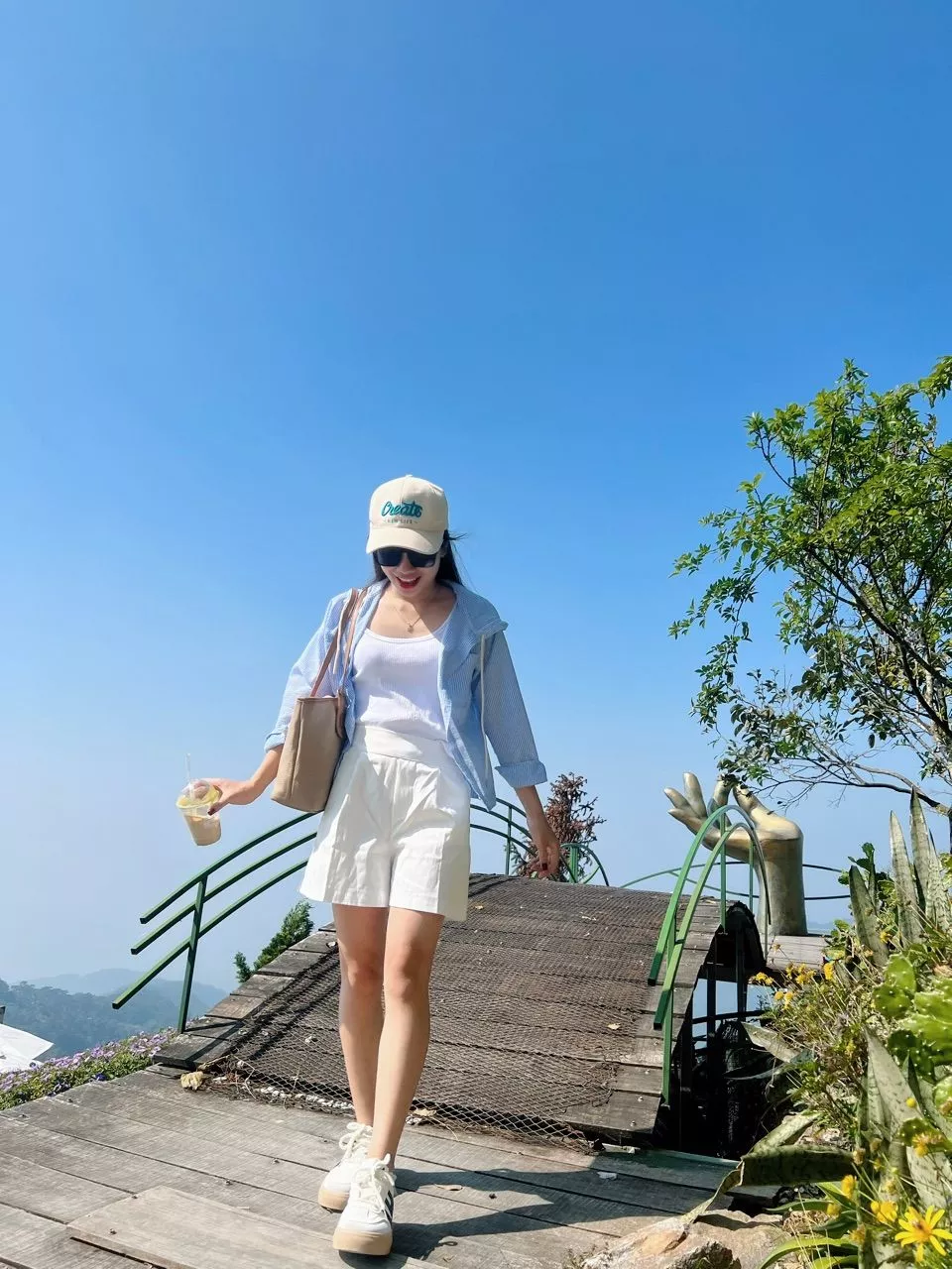 Che khuyết điểm: Form áo sơ mi dài tay và rộng giúp che đi phần bắp tay hoặc vòng 2 nếu bạn chưa tự tin, trong khi quần đùi trắng giúp tôn lên đôi chân dài.